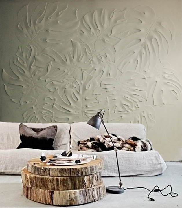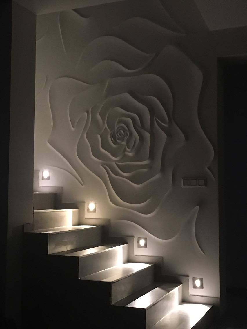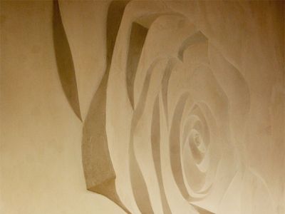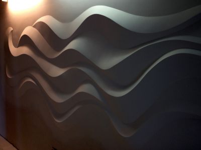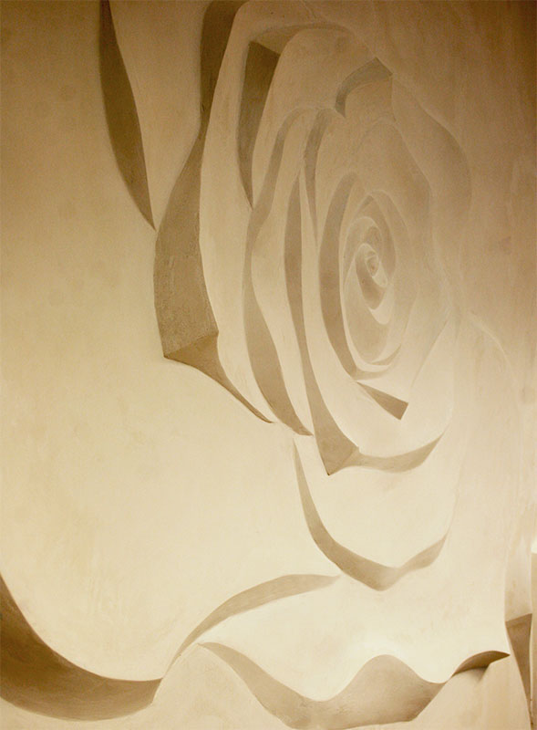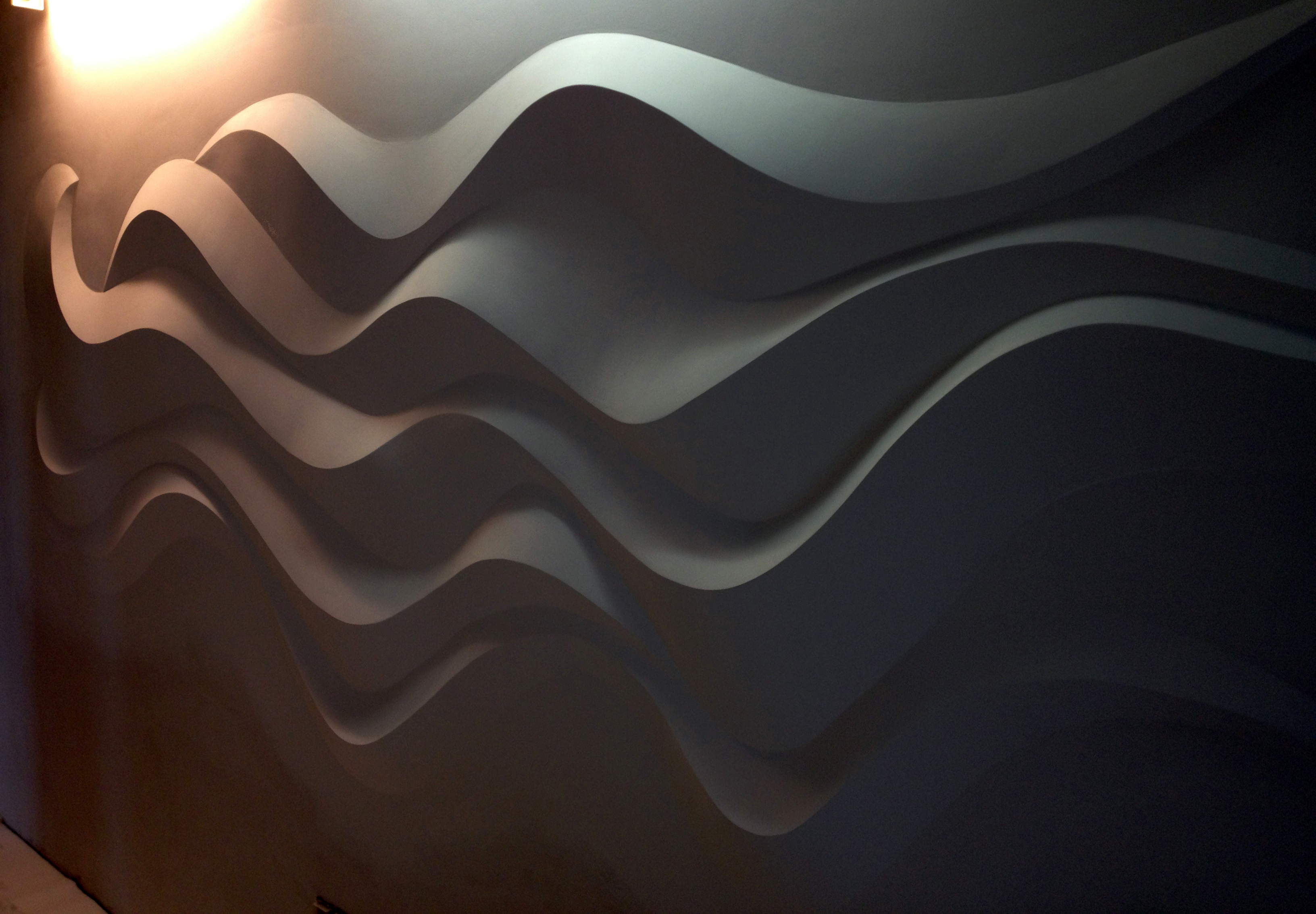 Sensitive und plastische Reliefs vermassen mit feinem Übergang in die Wandflächen ohne störende Fugen und Tragkonstrukzionen. Die sind keine 3D Platten, sondern Sie bilden einen organischen Komplex mit der Wand zusammen.